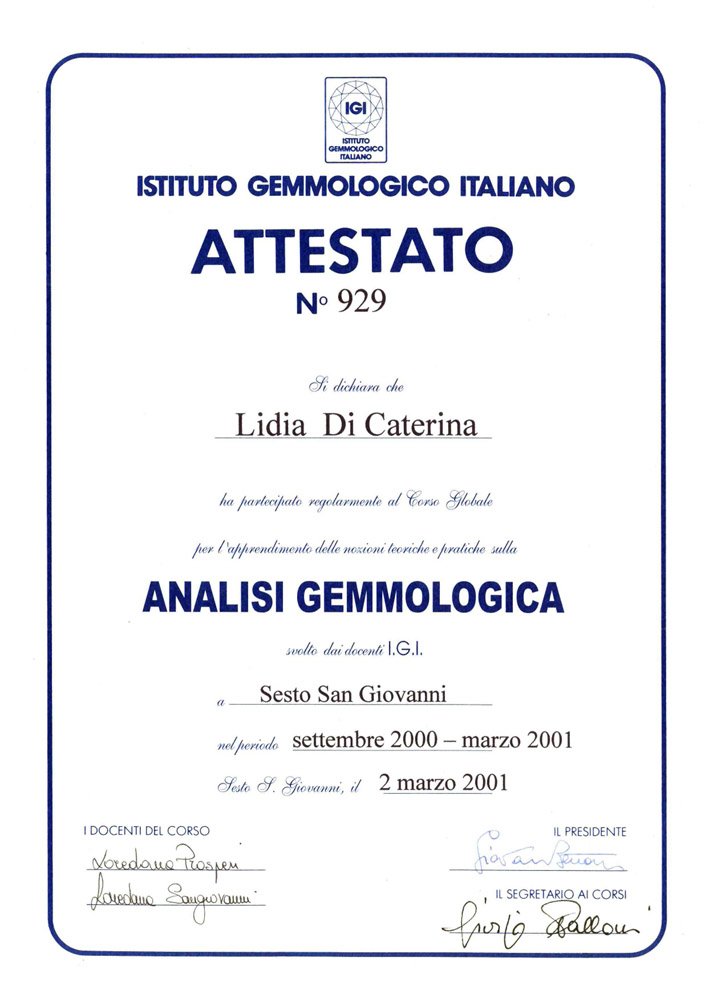 Lidia Di Caterina, titolare della Gioielleria Mantellato è esperta nel campo gemmologico e Diplomata Diamante presso l' I.G.I. (Istituto gemmologico Italiano), ha frequentato diversi corsi di aggiornamento e perfezionamento tra cui c/o la C.I.S.G.E.M. (Centro Informazione e Servizi Gemmologici) Azienda Speciale della Camera di Commercio di Milano.